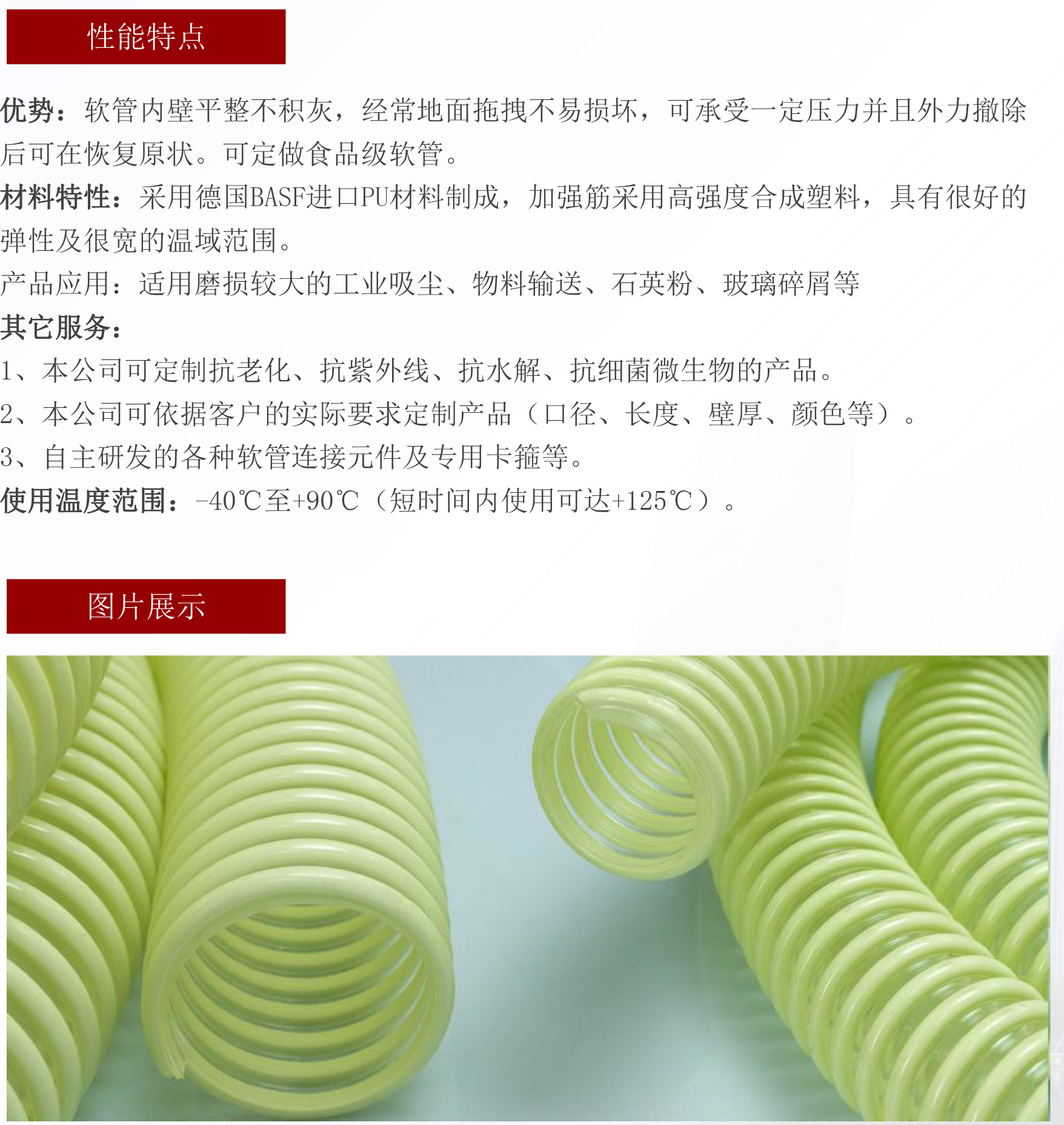 產(chǎn)品特點(diǎn):材料特性:采用德國(guó)BASF進(jìn)口PU材料制成,加強(qiáng)筋采用高強(qiáng)度合成塑料,具有很好的彈性及很寬的溫域范圍。產(chǎn)品應(yīng)用:適用磨損較大的工業(yè)吸塵、物料輸送、石英粉、玻璃碎屑等。