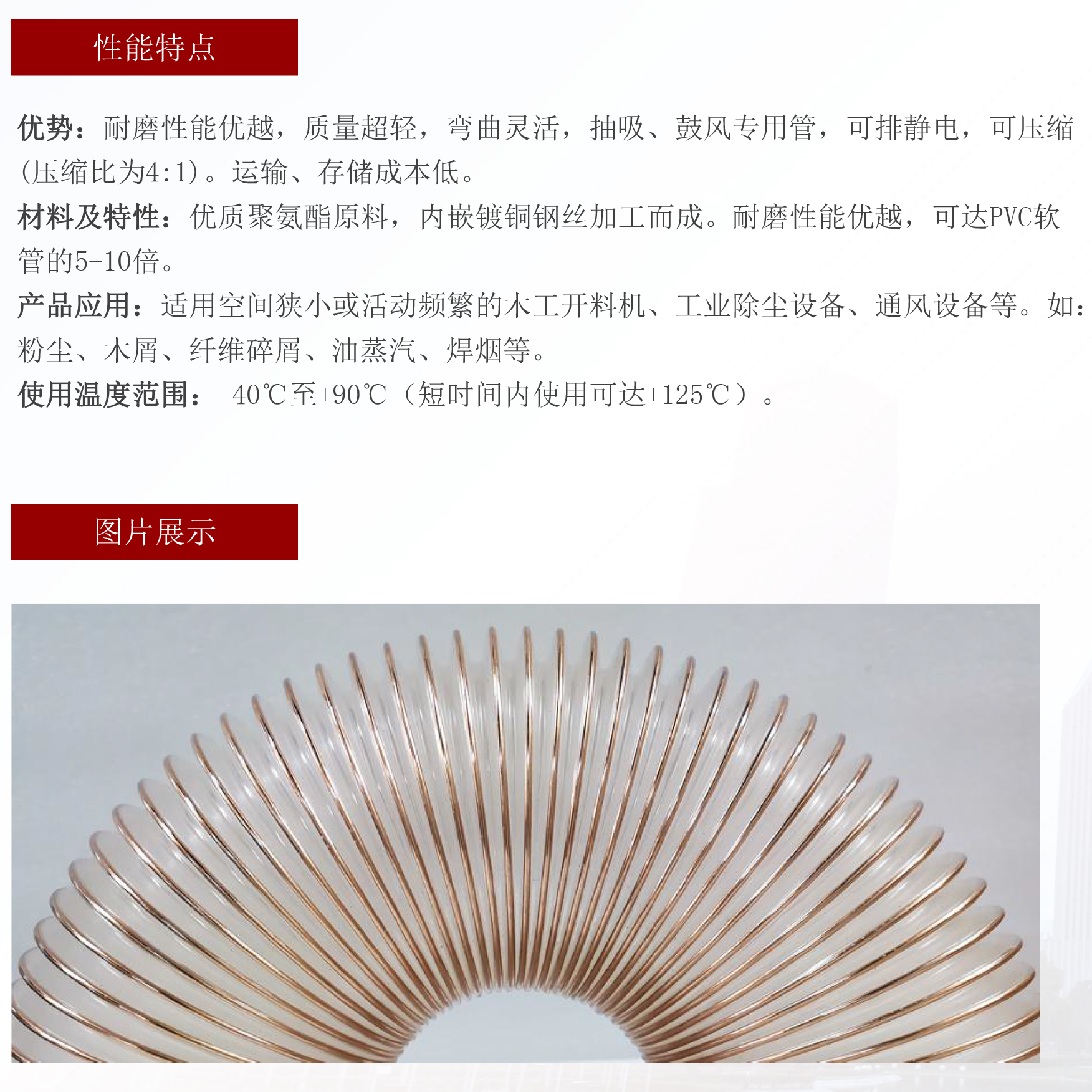 材料特性:優(yōu)質(zhì)聚氨酯原料,內(nèi)嵌銅鋼絲加工而成,耐磨性能優(yōu)越,可達(dá)PVC軟管的5-10倍。產(chǎn)品應(yīng)用:適用空間狹小或活動(dòng)頻繁的工業(yè)除塵設(shè)備、通風(fēng)設(shè)備等。如:粉塵、木屑、纖維碎屑、油蒸汽、焊煙等。