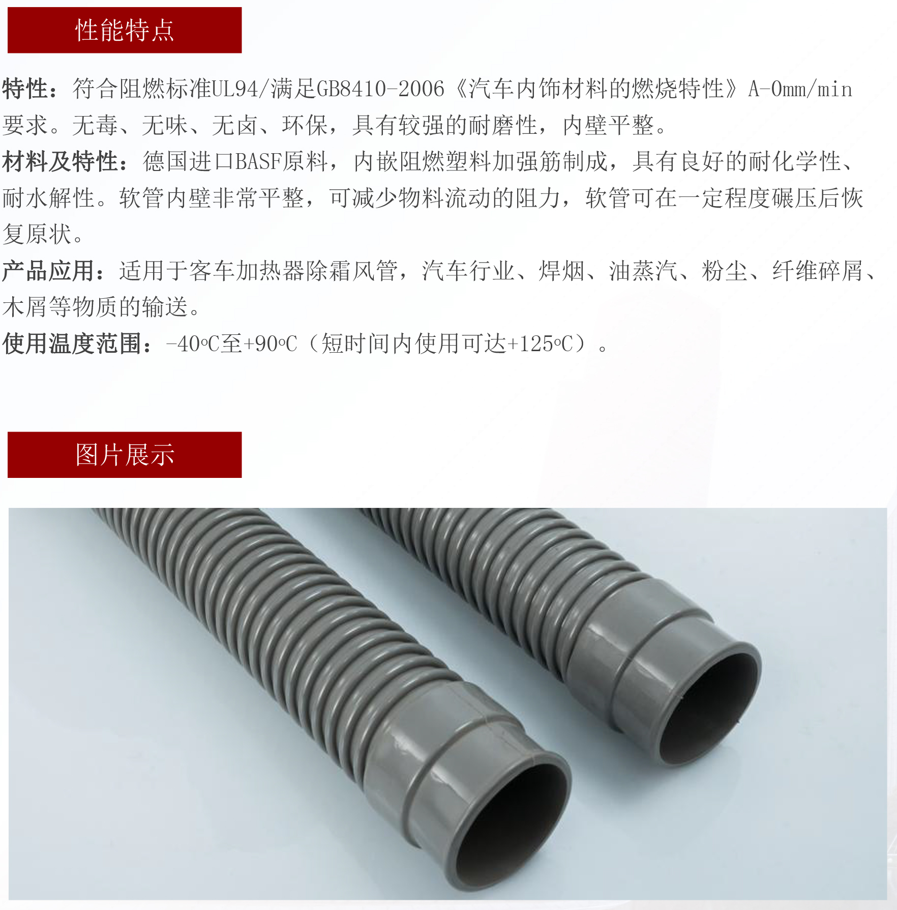 材料特性:采用德國BASF阻燃PU原料,內嵌阻燃塑料加強筋制成,具有耐化學性,耐水解性。軟管內壁非常平整,可減少物料流動的阻力,軟管可在一定程度碾壓后恢復原狀。產(chǎn)品應用:適用于冷風及暖風的輸送,汽車行業(yè)、焊煙、油蒸汽、粉塵、纖維碎屑、木屑等物質的輸送。