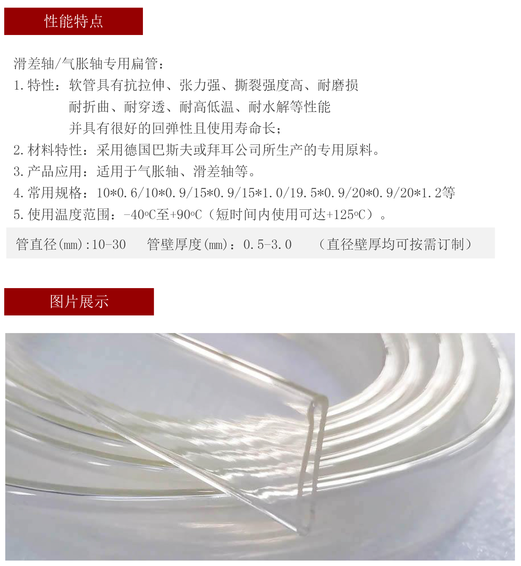 采用德國巴斯夫或拜耳公司所生產(chǎn)的專用原料,具有抗拉伸、張力強、撕裂強度高、耐磨損耐折曲、耐穿透、耐高低溫、耐水解等性能并具有很好的回彈性且使用壽命長!